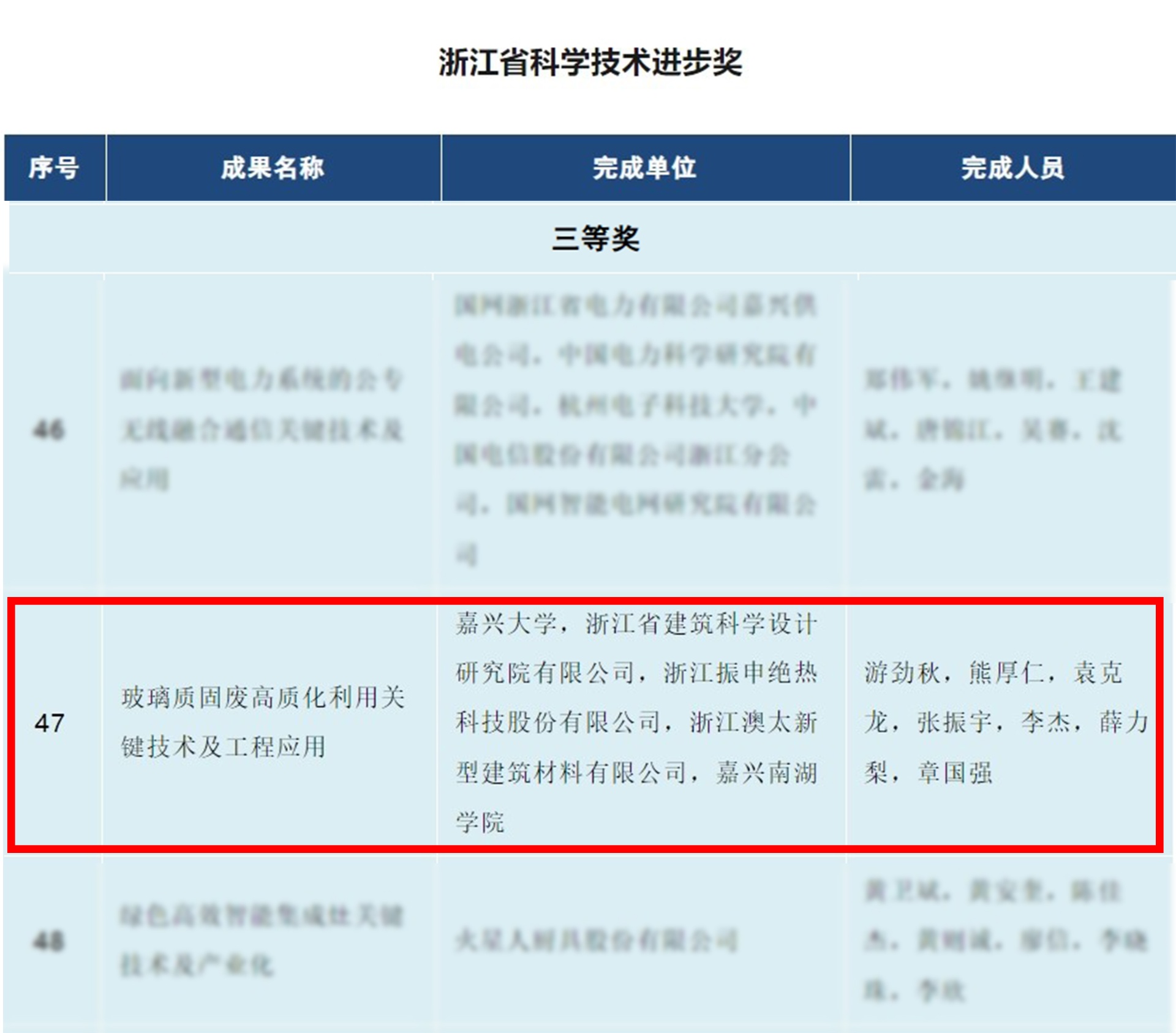 近日,加快建設創新浙江因地制宜發展新質生產力動員部署會暨全省科學技術獎勵大會在杭州舉行,浙江振申絕熱科技股份有限公司《玻璃質固廢高質化利用關鍵技術及工程應用》項目榮獲科學技術進步獎三等獎。這是公司連續第三年獲得該獎項。